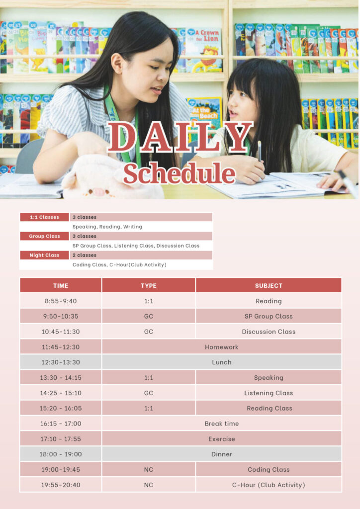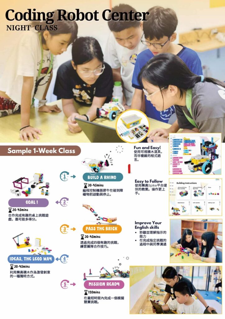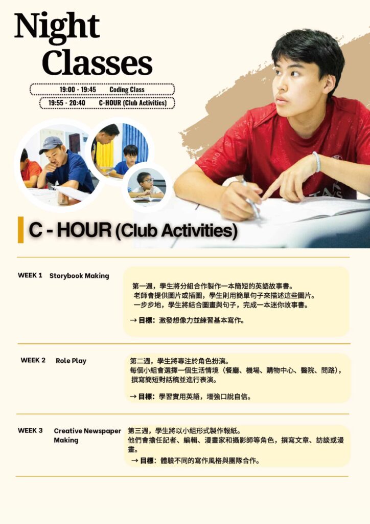 2堂晚間課:Coding(基礎程式設計課)、C-Hour(社團活動,透過遊戲、表演等增進團隊合作)