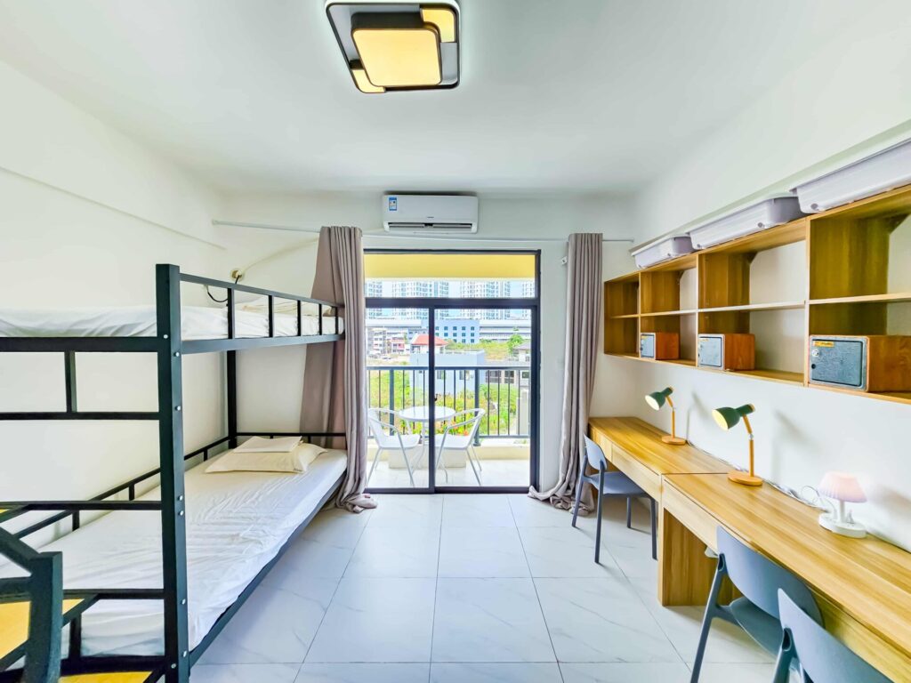 房間設備:免費WIFI、書桌、檯燈、冰箱、開放式衣架、熱水器、乾濕分離浴室、吹風機、獨立陽台